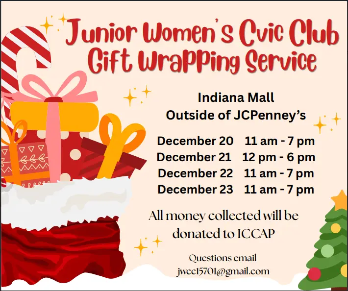 The Junior Women’s Civic Club will be hosting a Gift Wrapping Service at the Indiana Mall, located outside of JCPenney near Santa’s Castle. Shoppers are invited to bring their holiday gifts to be wrapped for a donation. All proceeds will directly support ICCAP (Indiana County Community Action Program), helping provide food and assistance to local families in need.